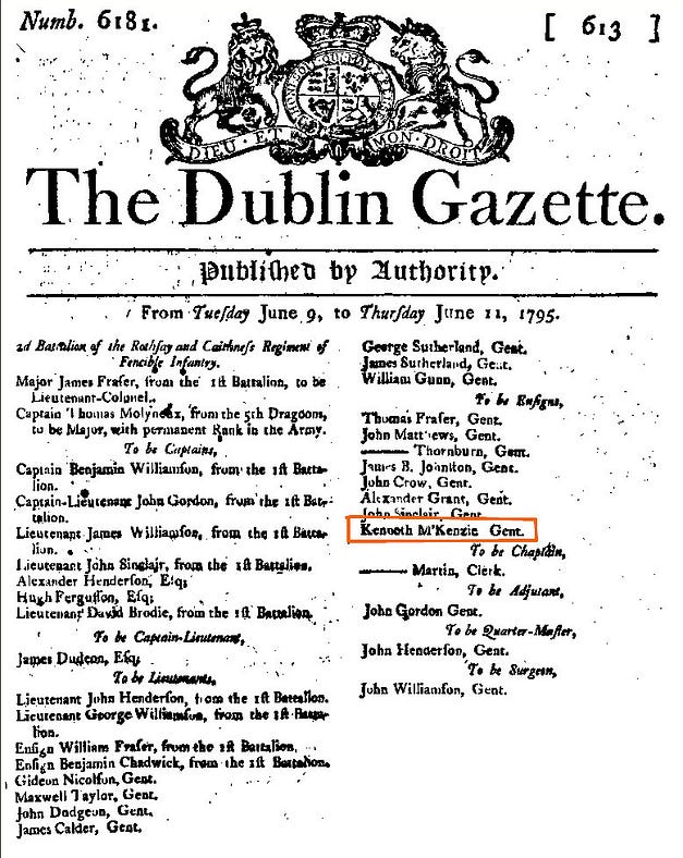 Come a voler mettere in pratica gli ideali della sua poetica, vestì l’uniforme imperiale, contribuendo a sedare per conto di Giorgio III, re di Gran Bretagna e d’Irlanda, nelle file del 2° battaglione Rothsay e Caithness, la rivolta irlandese del 1798. Giusto il tempo di raggiungere il grado di ufficiale e si ritirò nel 1802. Intanto nel 1799, a trentasette anni, si era sposato con l’irlandese Maria Shelton, di nobile famiglia. In Irlanda avrebbe messo radici. Si spostarono da Drews Court a Kilmeedy e infine a Fermoy, da dove non si sarebbero più mossi. Attesero il suo congedo definitivo e diedero al mondo sette figli in quindici anni. Nell’ultimo capitolo della sua vita svolse il proprio dovere in un piccolo e pacifico ufficio postale di provincia, rispettato e benvoluto dalla sua comunità adottiva, prossimo a godersi la pensione in una casa piena di vita. Oltre alla numerosa prole, la dimora era ritrovo di ospiti abituali e occasionali. Un’accoglienza particolare era rivolta soprattutto ai connazionali scozzesi di passaggio sulle rive del fiume Blackwater. Talmente ospitale che Ronald Black nel suo An Lasair, forse sovrainterpretando quelle espressioni come “le abitudini di un uomo di mare hanno un’influenza deteriorante sui sentimenti giovanili” e “accarezzare letteralmente i suoi compatrioti” vergate in Sar-obair, arriva a sostenere che John Mackenzie non poteva alludere più esplicitamente alla possibile omosessualità di Kenneth. Tutto apparentemente idilliaco.
