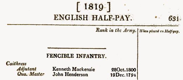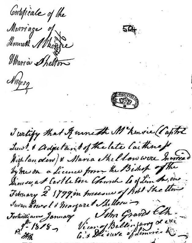 Io certifico di aver assistito Kenneth Mackenzie, ex aiutante dei Caithness Highlanders, il quale è deceduto per la febbre tifoide il 20 gennaio 1819 diciannove.